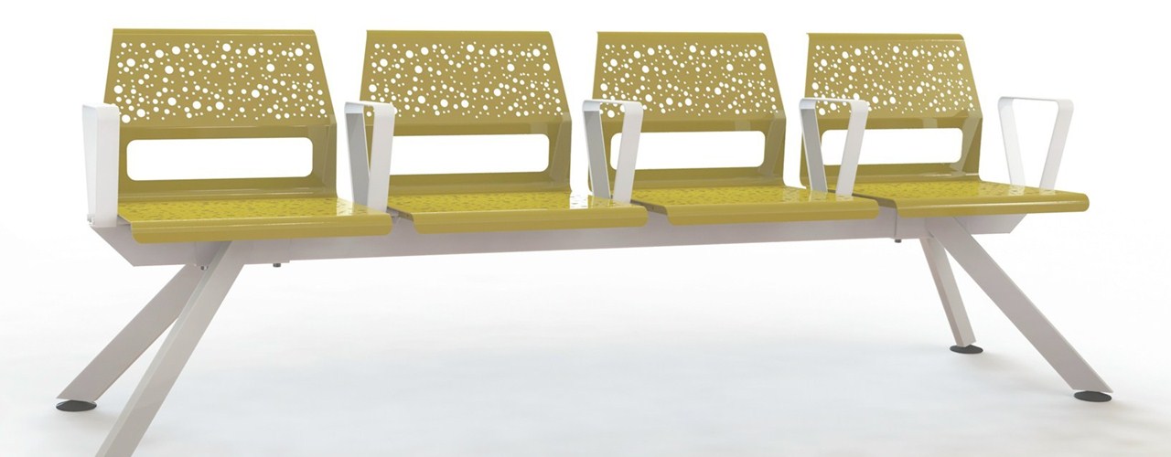 Сиденья выполнены из стального листа с микроперфорацией, что обеспечивает прочность и легкость в уходе. Цвета эпоксидной краски, такие как бирюзовый и горчичный, подчеркивают современный стиль.