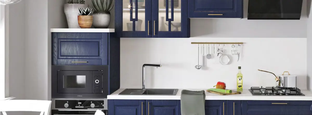 - «Антея»: тёмно-синие матовые фасады, подходит для создания греческой атмосферы. Материал — МДФ с покрытием под дерево, долговечность — от 10 лет.