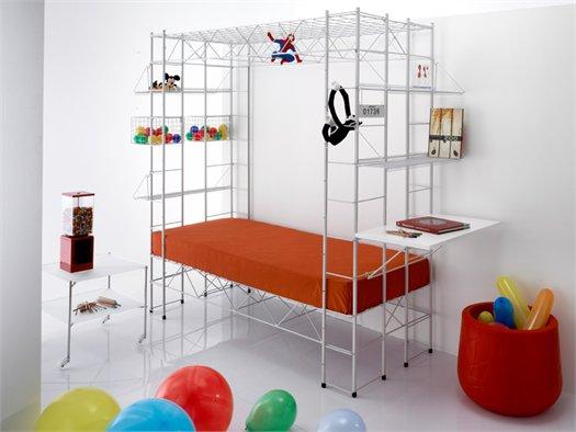 Знаковый пример — 'Кабина РОБОТОВ' от Бруно Мунари. Эта мебель включает в себя кровать, письменный стол, книжный шкаф и множество полок и крючков. Изготовленная из прочного стального стержня, она предлагает надежность и долговечность.
