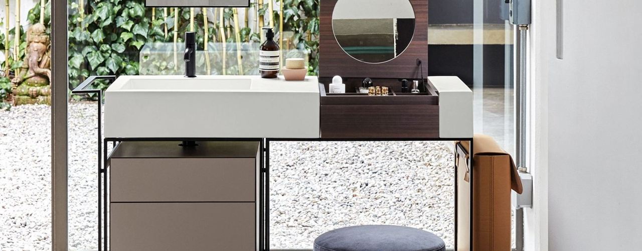 Коллекция Narciso предлагает уникальные решения для ванных комнат, вдохновленные духом прошлых лет. Включает элементы, такие как керамический умывальник и встроенный туалетный столик.