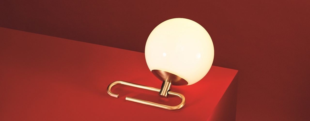 - Белый стеклянный шар, скользящий по латунному кольцу, позволяет регулировать направление света.