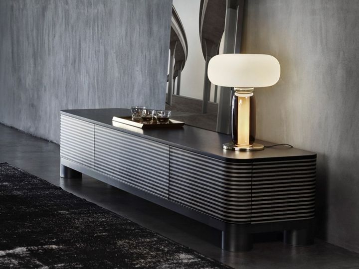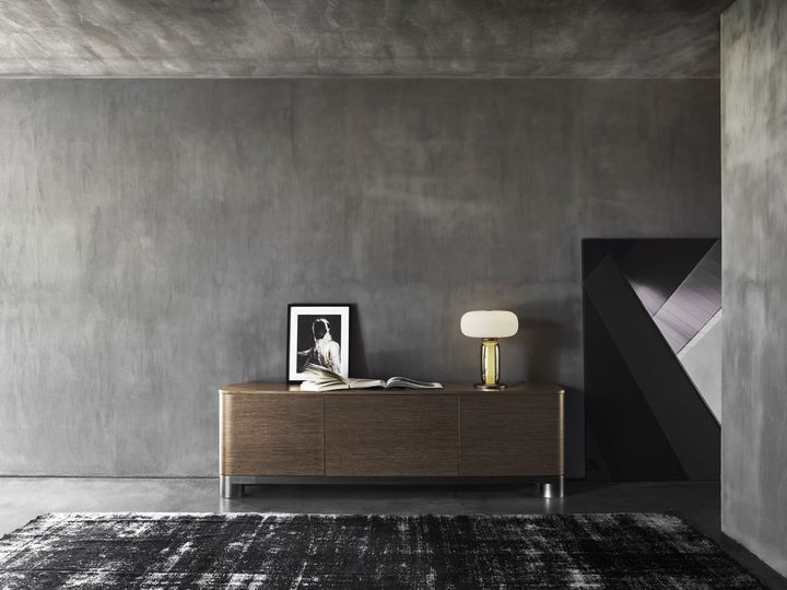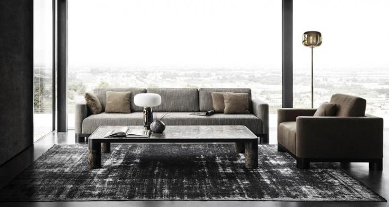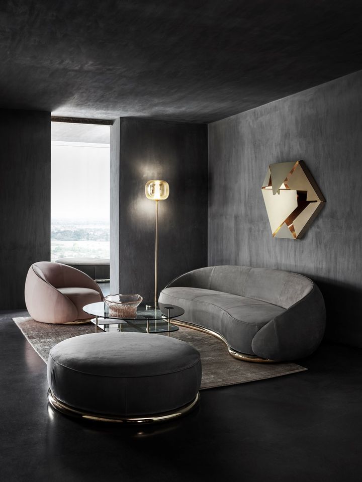 ТАРАНТИНО – мягкий диван, вдохновленный стилем 70-х годов, с подушками из гусиного пуха и хлопкового вельвета. ABBRACCI – кресло с мягкой кожей нубук и латунной трубкой у основания, подчеркивающее изогнутую форму.