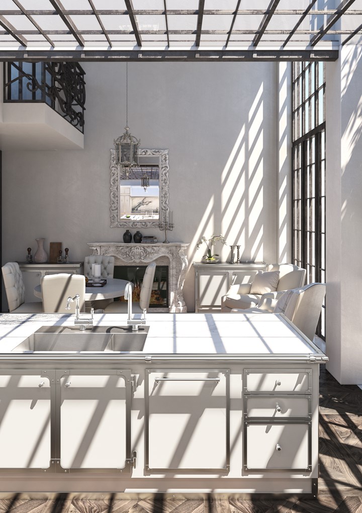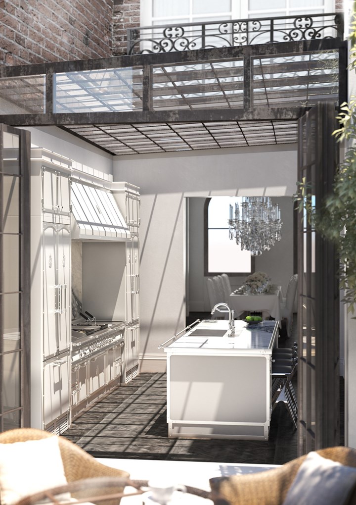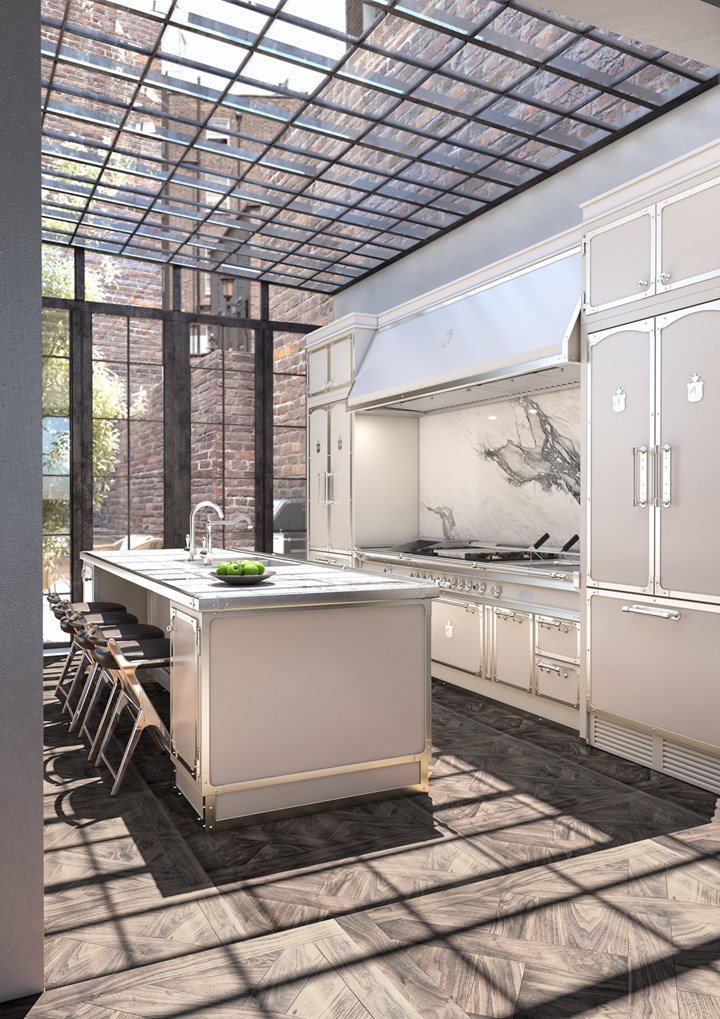 Officine Gullo предлагает нестандартные решения, как в проекте "Зеленый дом", где кухня выполнена из толстостенной стали с огнестойким покрытием, что обеспечивает ей долговечность и стильный внешний вид.