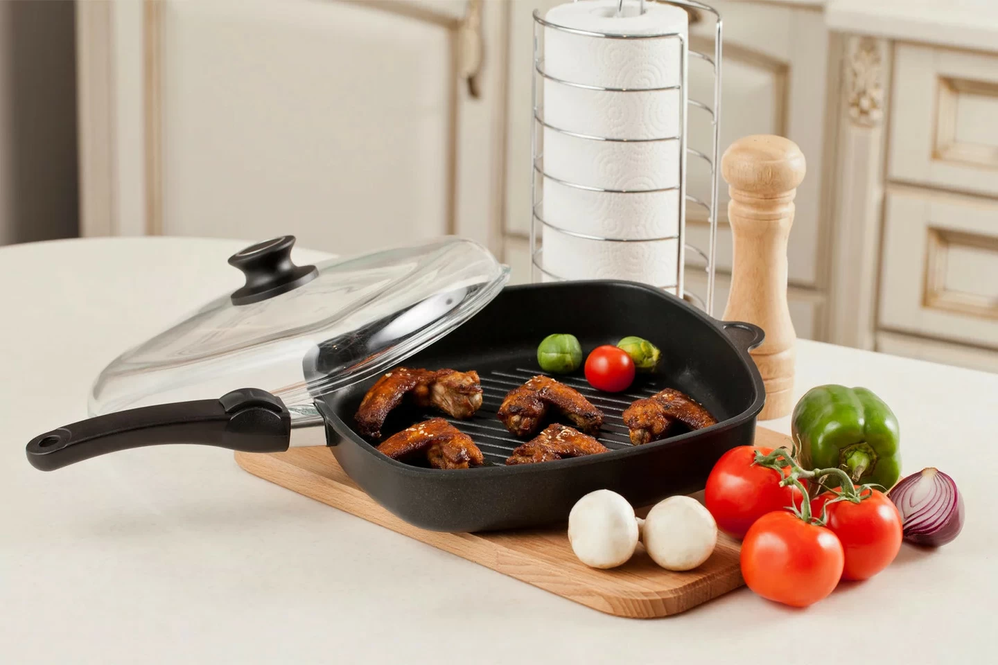Сковороды AMT GastroGuss, такие как гриль и WOK, позволяют готовить блюда с минимальным использованием масла, сохраняя натуральный вкус и пользу продуктов.