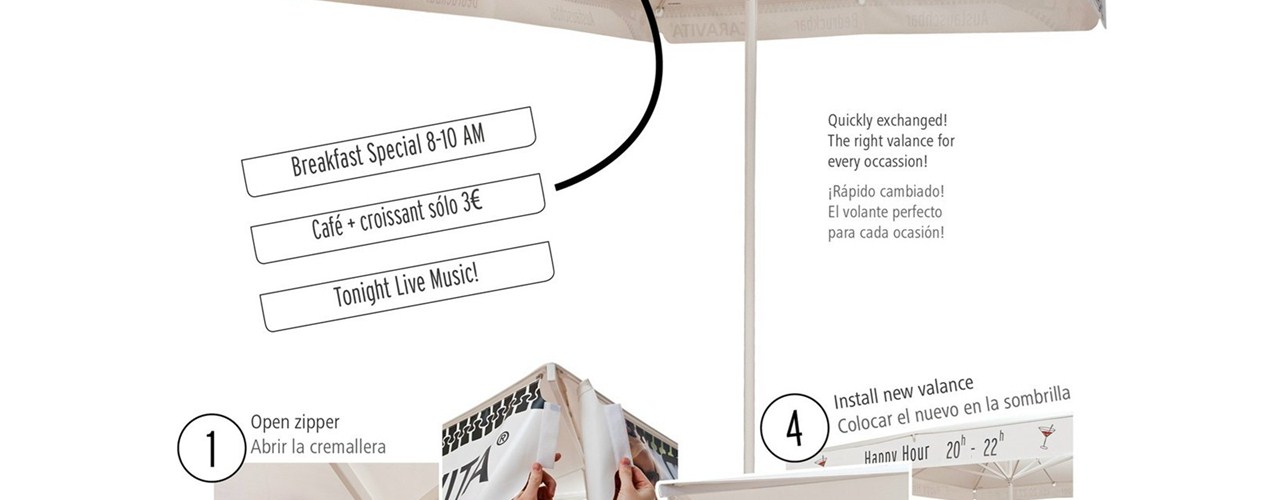 Caravita предлагает революционное решение — подзоры для зонтов, которые можно легко менять. Это позволяет гостиницам и ресторанам быстро адаптировать наружную рекламу к текущим предложениям и акциям. Каждый подзор представляет собой сменную обшивку, которую можно заменить за считанные минуты.