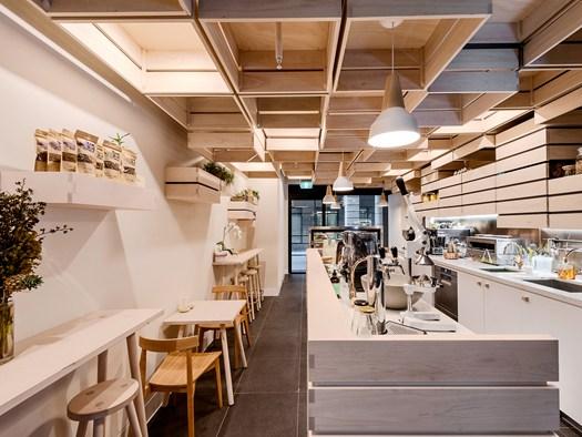 Современные интерьеры кафе часто стремятся к уникальности и функциональности. Примером такого подхода стал проект архитектора Кея Китаймы, который использовал подвесные ящики для фруктов в дизайне кафе Hunters Roots и Juice Bar в Мельбурне. Эти элементы не только создают скульптурные формы, но и оптимизируют пространство.