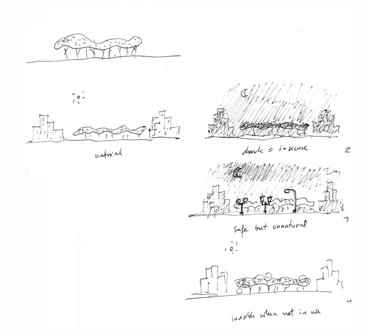 Проект O представляет собой светильник для общественных пространств, который не нарушает гармонию естественной среды, предлагая свет только по мере необходимости. Он минимально вторгается в ландшафт благодаря активизации сенсорами движения.