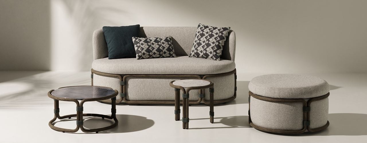 Коллекция Rotin включает диваны, кресла, журнальные столики и пуфы, выполненные из маринованного тика. Она вдохновлена азиатскими традициями, использующими бамбук как основной элемент.