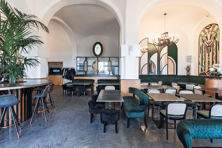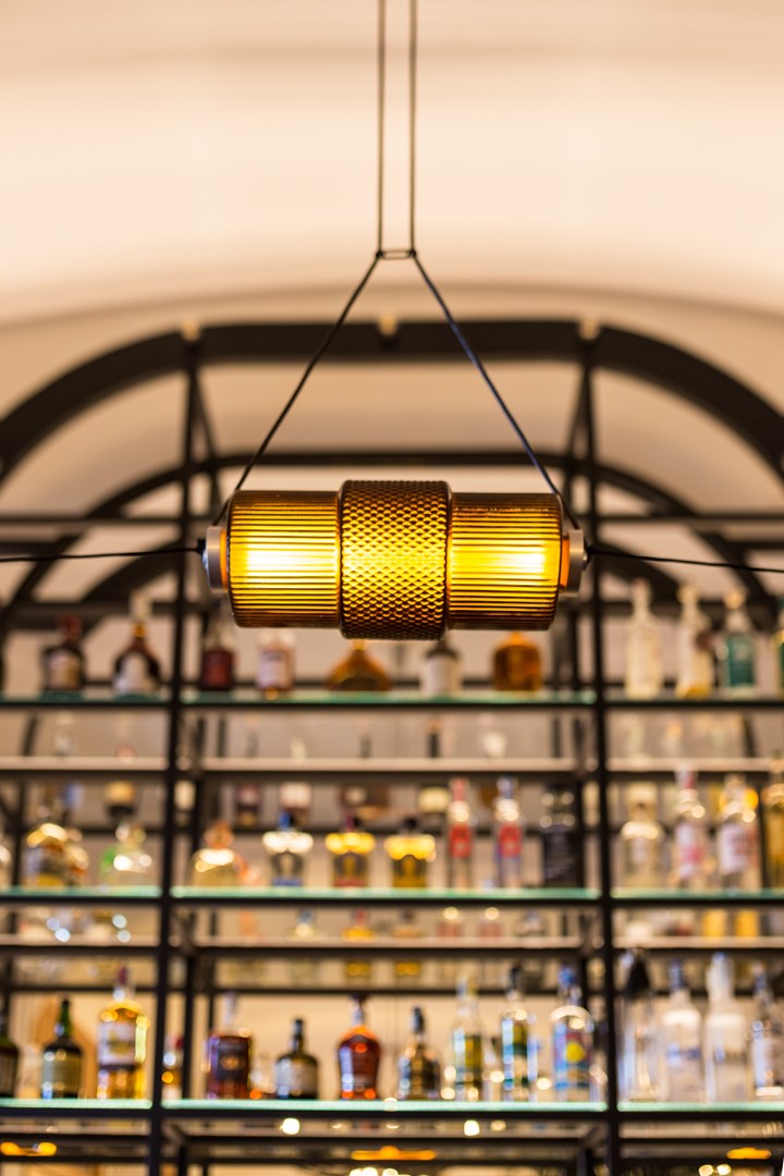 Использованы металлические и стеклянные элементы в стиле ар-деко, которые подчеркивают архитектурные особенности здания.