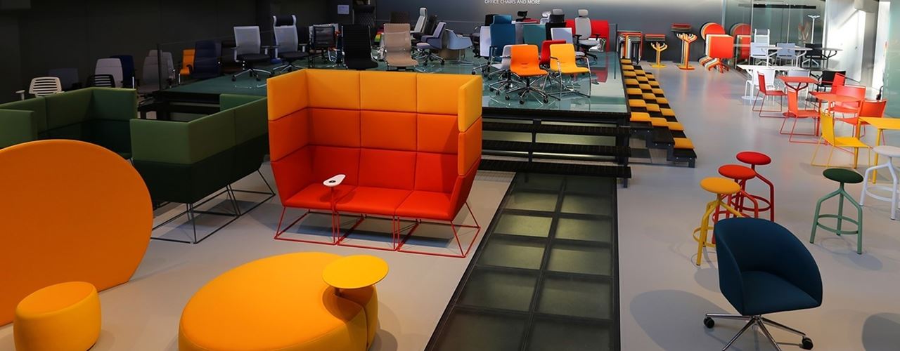 Были представлены офисные стулья с новыми материалами и отделкой, а также диван George, который можно модифицировать в зависимости от потребностей.