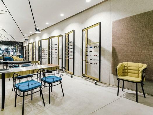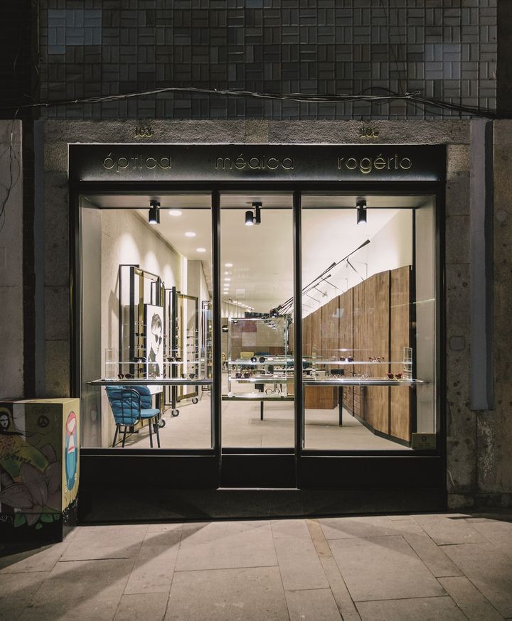 Проект Óptica Medica Rógerio в Порту включает уникальное сочетание вощеного бетона и массива дерева, обеспечивая современный и элегантный вид.