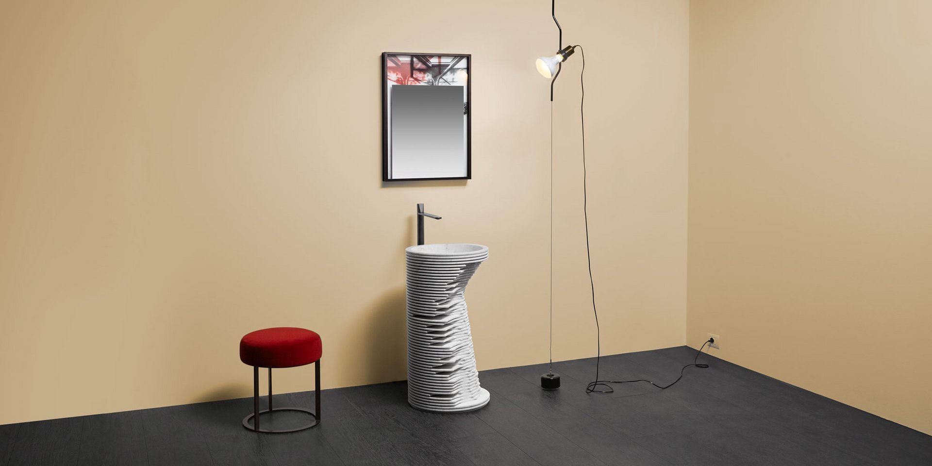 Идея этого умывальника родилась при наблюдении за грубой обработкой мраморных скульптур, в которой трехмерная форма скульптуры очерчена последовательными ступенями и на разной глубине алмазного диска, управляемого машиной с числовым программным управлением.