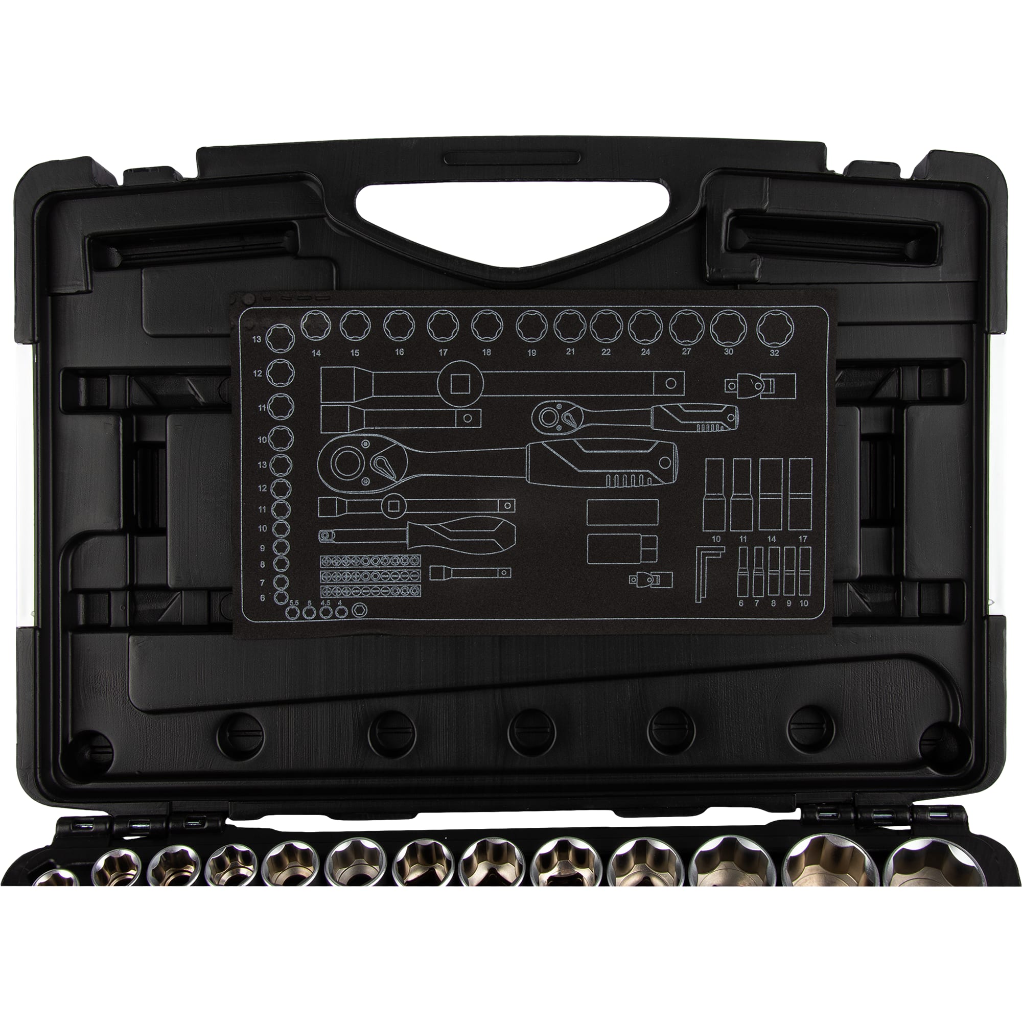 | Состав комплекта | 2 ключа с храповым механизмом, 150 мм 1/4 дюйма и 250 мм 1/2 дюйма. 28 шестигранных головок, 1/4 дюйма, 4 мм, 4,5 мм, 5 мм, 5,5 мм, 6 мм, 7 мм, 8 мм, 9 мм, 10 мм, 11 мм, 12 мм, 13 мм. 1/2 дюйма, 10 мм, 11 мм, 12 мм, 13 мм, 14 мм, 15 мм, 16 мм, 17 мм, 18 мм, 19 мм, 21 мм, 22 мм, 24 мм, 27 мм, 30 мм и 32 мм. 2 удлинителя 1/4" 50 мм и 1/2" 125 мм. 11 удлиненных головок 1/4", 6, 7, 8, 9, 19 мм и 1/2 дюйма, 10, 11, 14, 16, 17, 21 мм. 4 шестигранных ключа. 32 насадки-отвертки. держатель бит 1/4 дюйма |