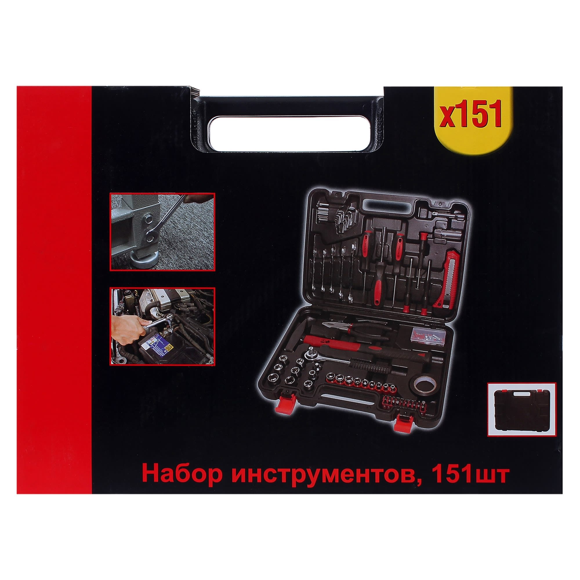 | Состав комплекта | комбинированные гаечные ключи с трещоткой, воротки, удлинители, отвертки, нож с сегментированным лезвием, большой молоток и плоскогубцы, торцевые головки на 3/8" и 1/8", гвозди, дюбели, насадки и адаптеры, упаковка изоляционной ленты. |