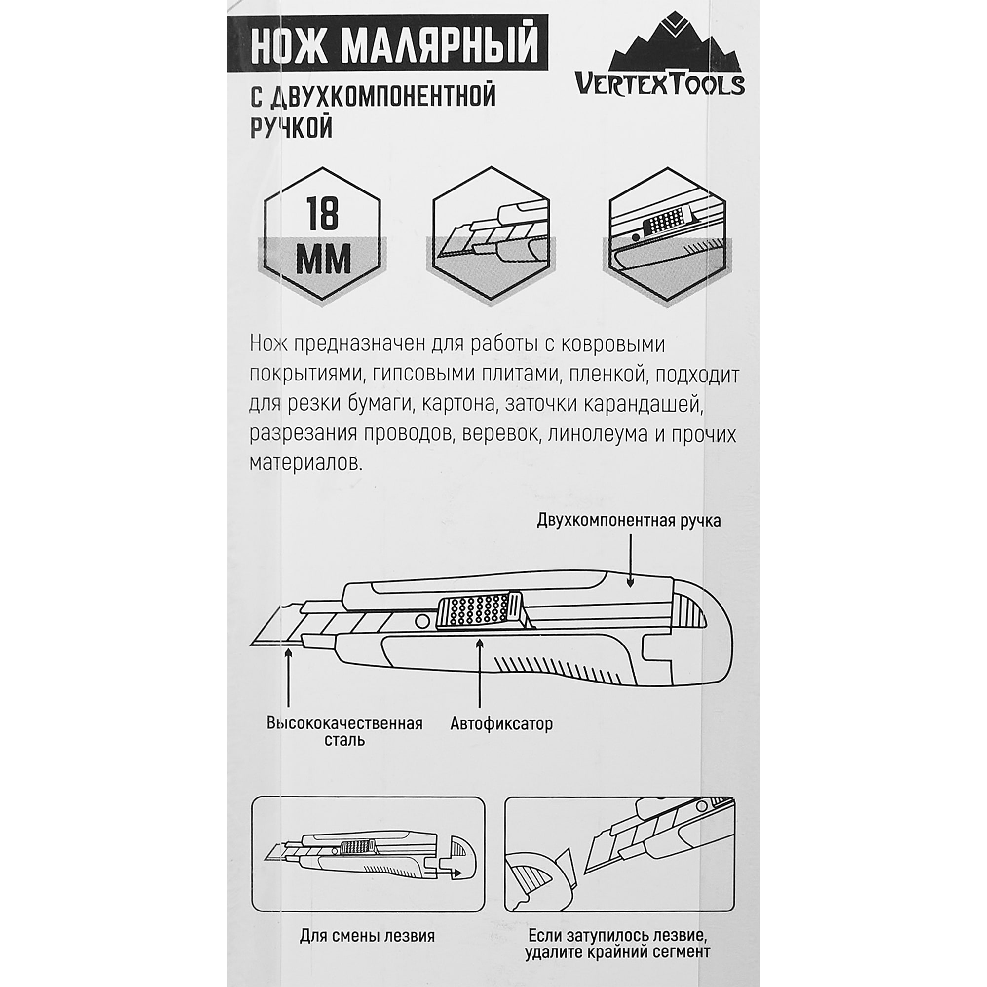 Строительный нож Vertextools сочетает эргономичный дизайн и высокую функциональность, обеспечивая комфортную работу с разнообразными материалами. Инструмент создан для специалистов, ценящих надежность и удобство в ежедневной эксплуатации.