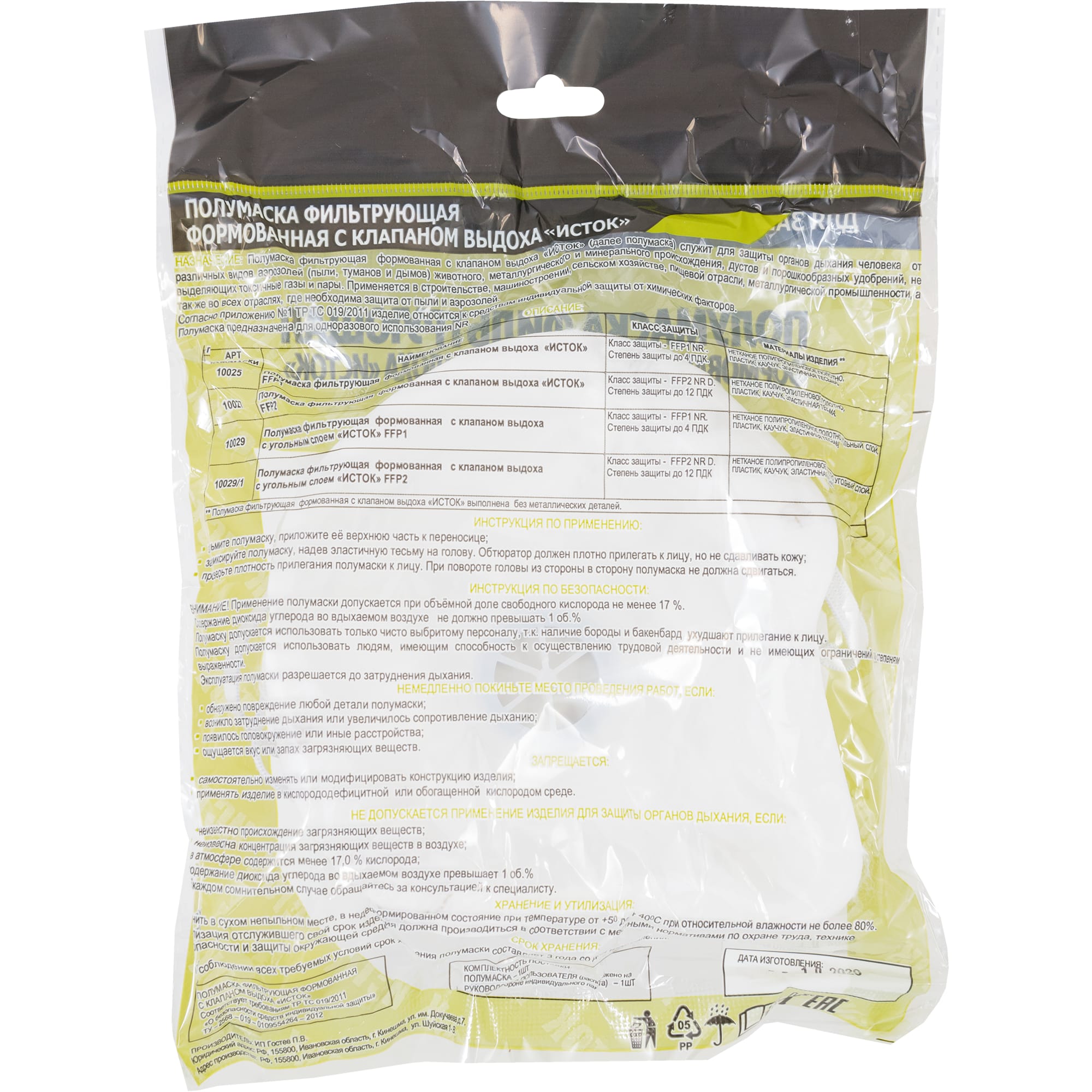| Класс защиты респиратора | FFP1 |