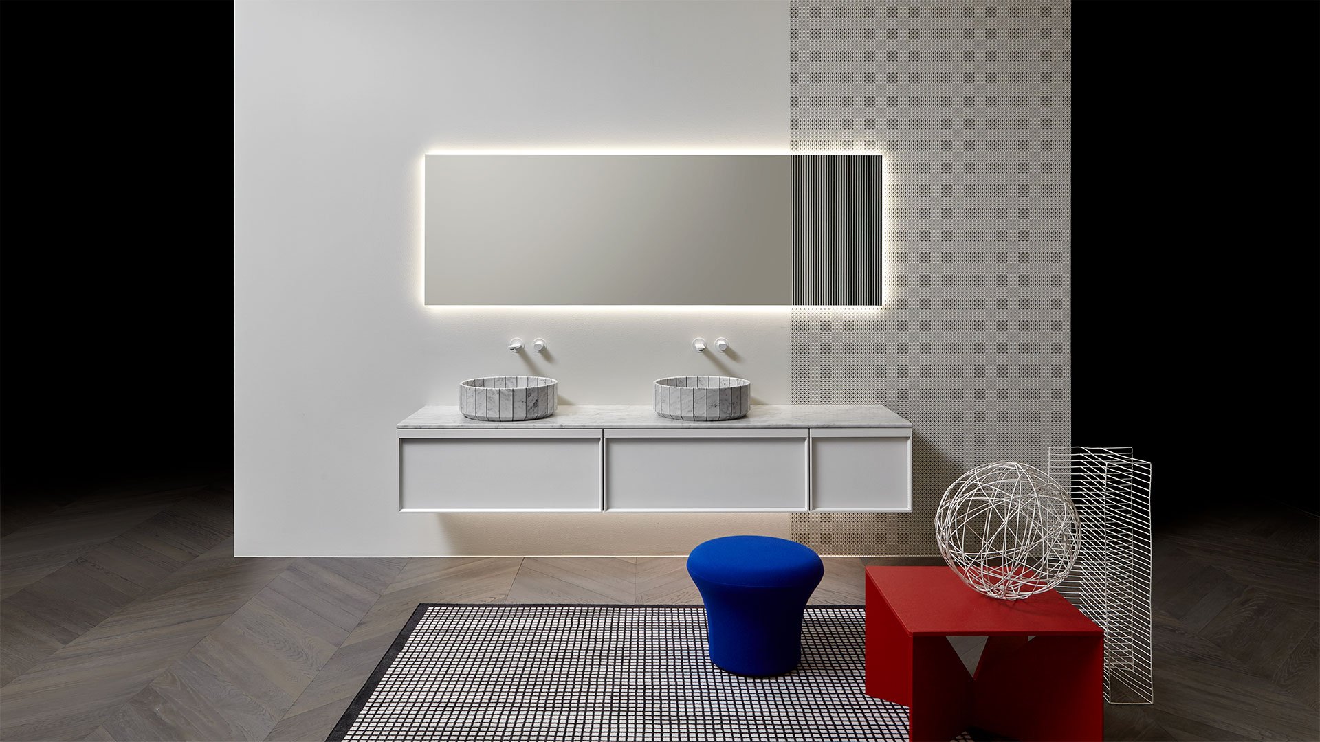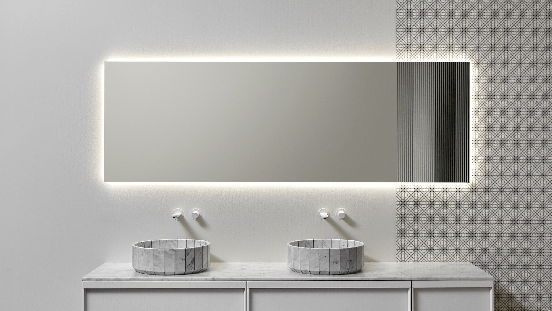 Красивое и незаменимое, Distinto - это зеркало, очерченное крайними линиями, это объект прямоугольной формы, который идеально сочетается с стеной, покрытой обоями Tralerighe. Зеркало для ванной комнаты Distinto представляет собой изделие без кромок с ребристым декоративным узором на одной из двух коротких сторон. На стене создается интригующая игра контрастов между Distinto, обоями и игрой света. Зеркало оснащено светодиодной системой освещения, которая дополняет контраст между гладким и ребристым зеркалом.