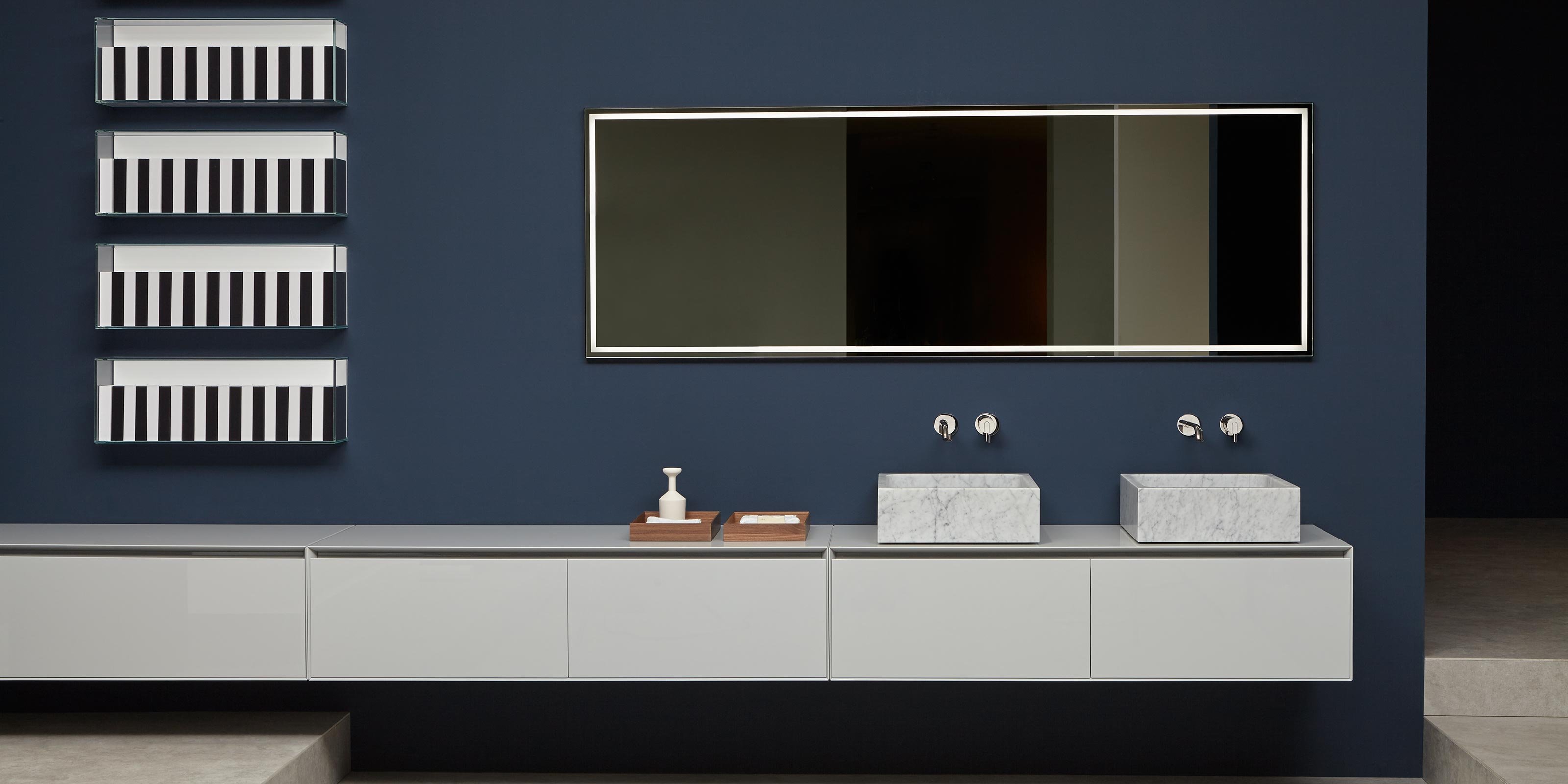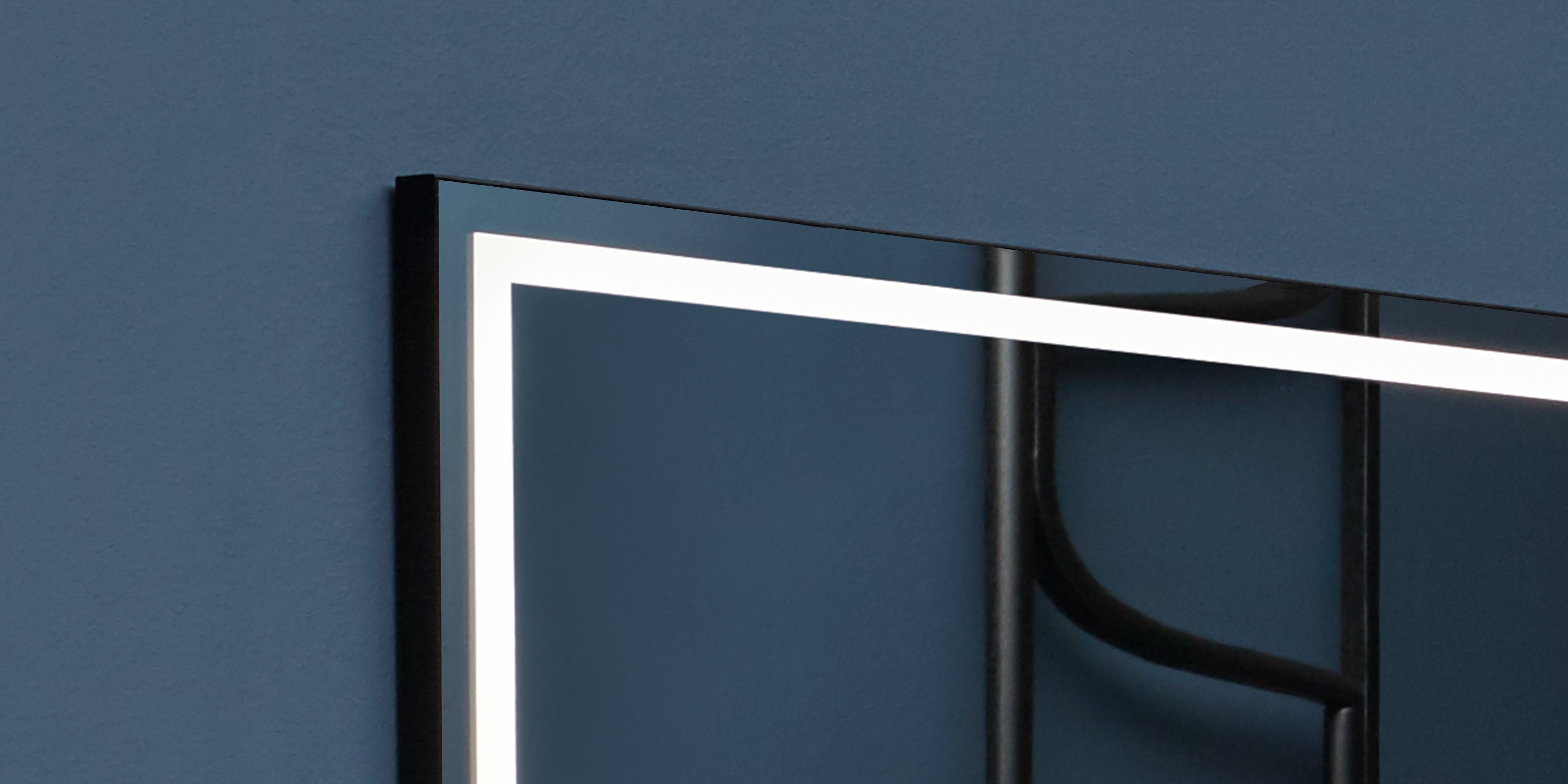 Двойная рамка, светоотражающая и яркая, усиливают периметр поверхности. Напильник представляет собой зеркало толщиной 4 мм с пескоструйной обработкой по периметру 1,5 см, оснащенное светодиодной подсветкой. Он имеет черную алюминиевую структуру, которая придает элегантность контексту.