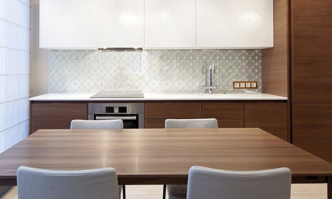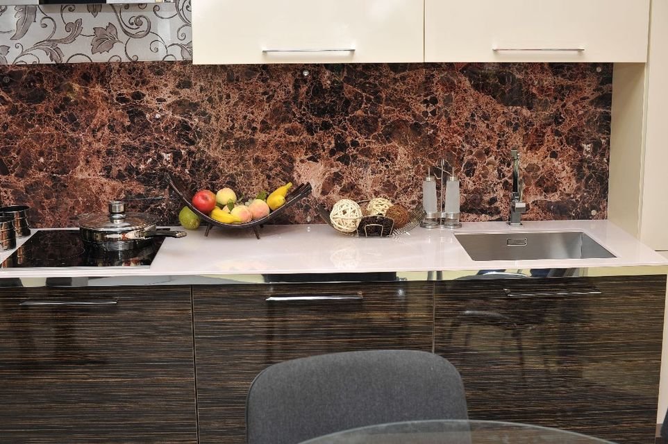 Стекло зеркалит, визуально увеличивая размеры помещения, расширяя пространство. Это ключевой момент в дизайне малогабаритных кухонь и дополнительный плюс в оформлении больших просторных помещений.
