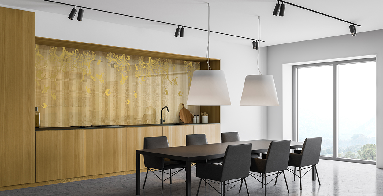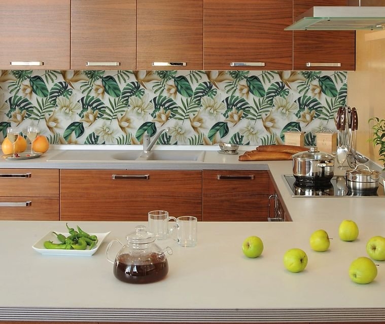 Стекло зеркалит, визуально увеличивая размеры помещения, расширяя пространство. Это ключевой момент в дизайне малогабаритных кухонь и дополнительный плюс в оформлении больших просторных помещений.