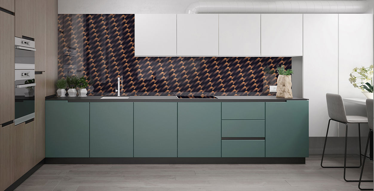 Стекло зеркалит, визуально увеличивая размеры помещения, расширяя пространство. Это ключевой момент в дизайне малогабаритных кухонь и дополнительный плюс в оформлении больших просторных помещений.