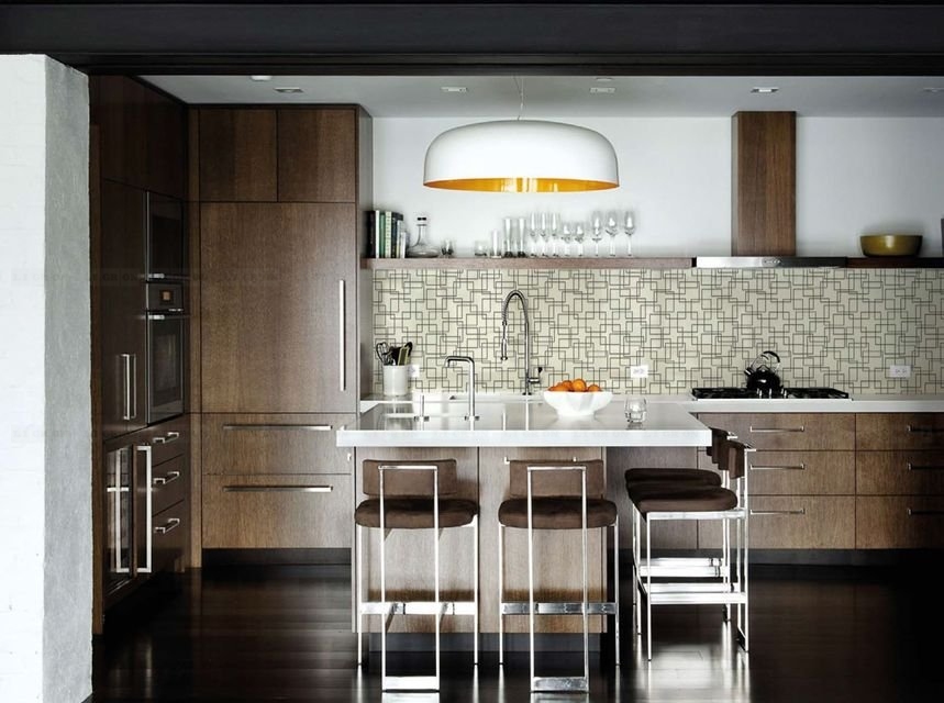 Стекло зеркалит, визуально увеличивая размеры помещения, расширяя пространство. Это ключевой момент в дизайне малогабаритных кухонь и дополнительный плюс в оформлении больших просторных помещений.