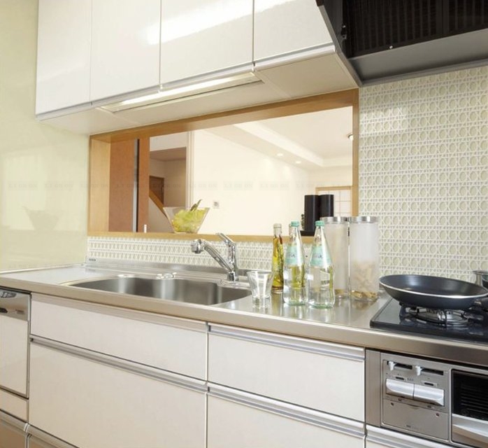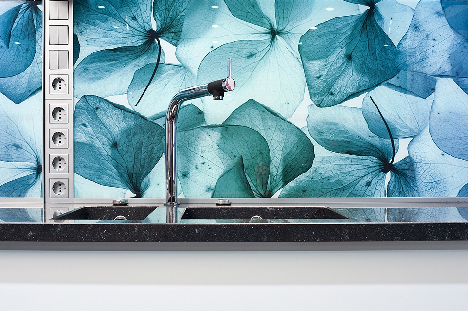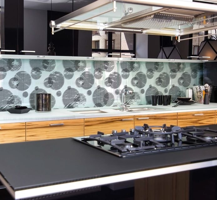 Стекло зеркалит, визуально увеличивая размеры помещения, расширяя пространство. Это ключевой момент в дизайне малогабаритных кухонь и дополнительный плюс в оформлении больших просторных помещений.