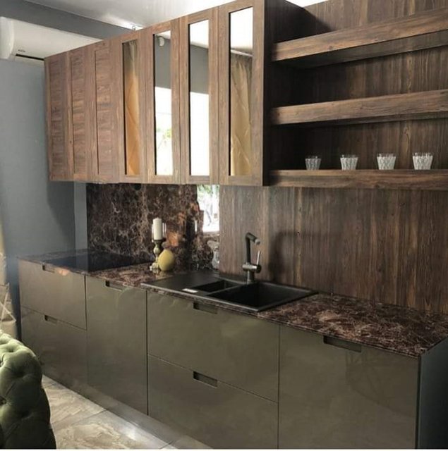 Стекло зеркалит, визуально увеличивая размеры помещения, расширяя пространство. Это ключевой момент в дизайне малогабаритных кухонь и дополнительный плюс в оформлении больших просторных помещений.