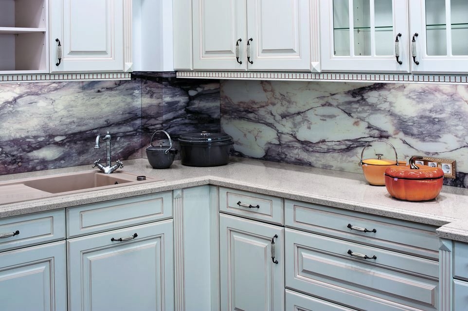 Обладает высокой теплостойкостью, стеновые панели можно размещать непосредственно за газовой варочной панелью. При этом ставить горячее на поверхность кварца нерекомендуется.