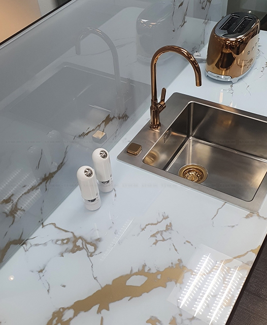 Возможность размещения в зонах сильного нагрева или непосредственно за газовой варочной поверхностью. Лучшая альтернатива неустойчивым к сильному нагреву материалам, таким как искусственный камень.