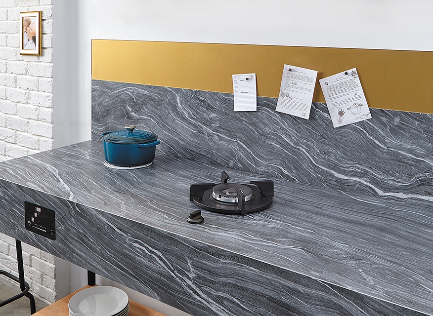 Столешницы Ceralan изготавливаются с подложкой из экструдированного пенополистирола. По длинным сторонам столешница имеет усиление в виде специального металлического профиля, который клеится вплотную к канту между подложкой и кантом столешницы.