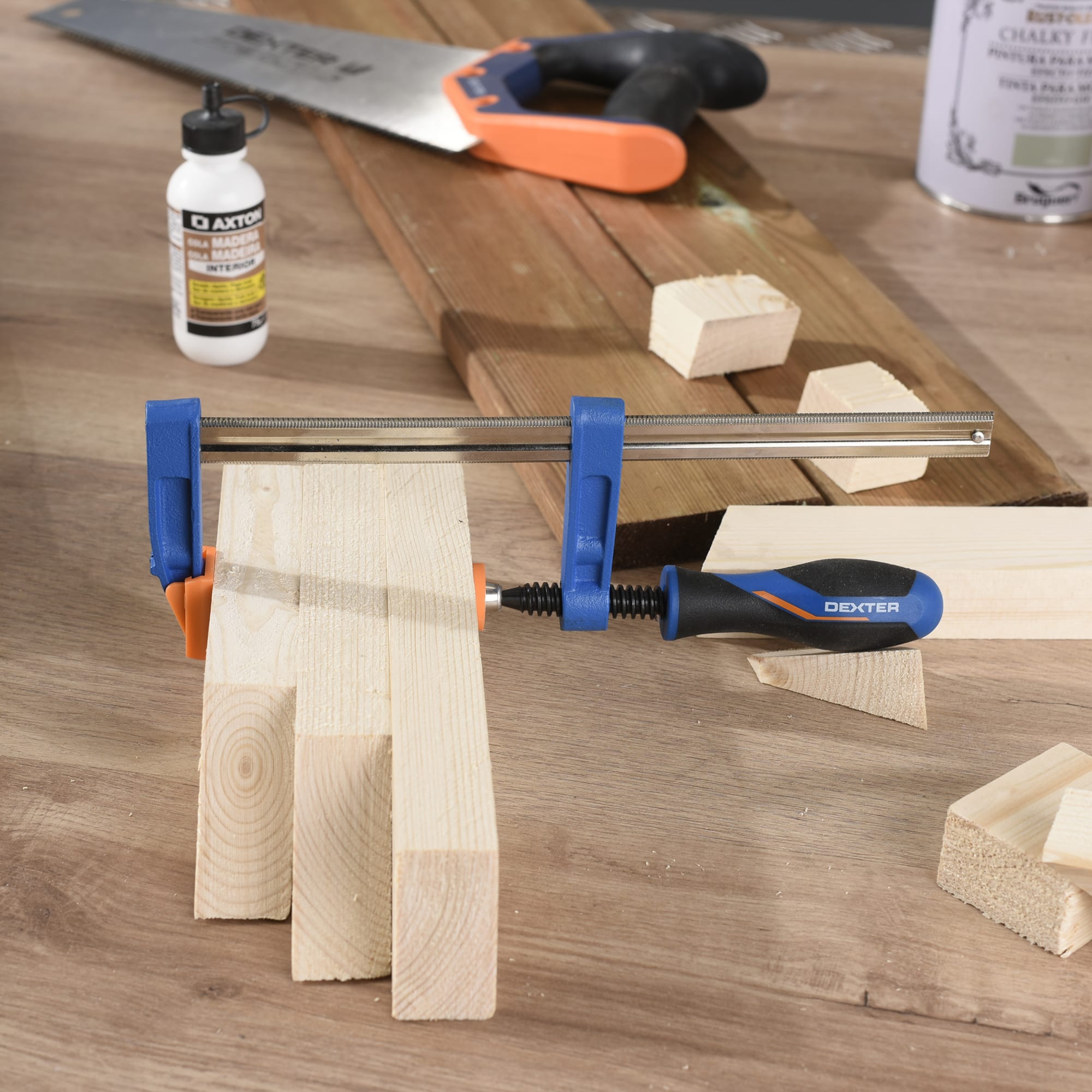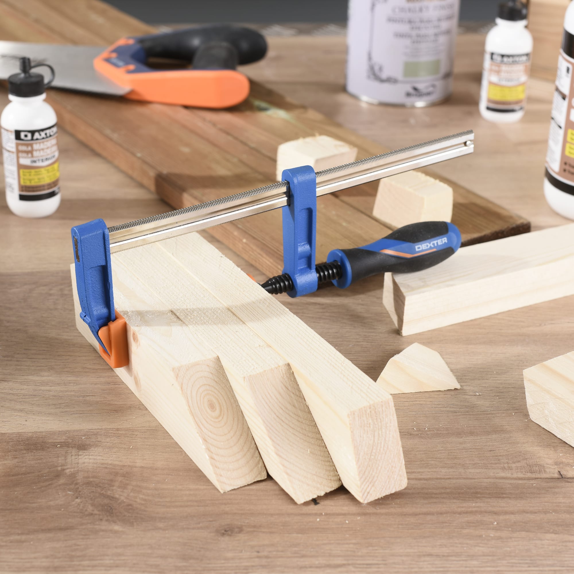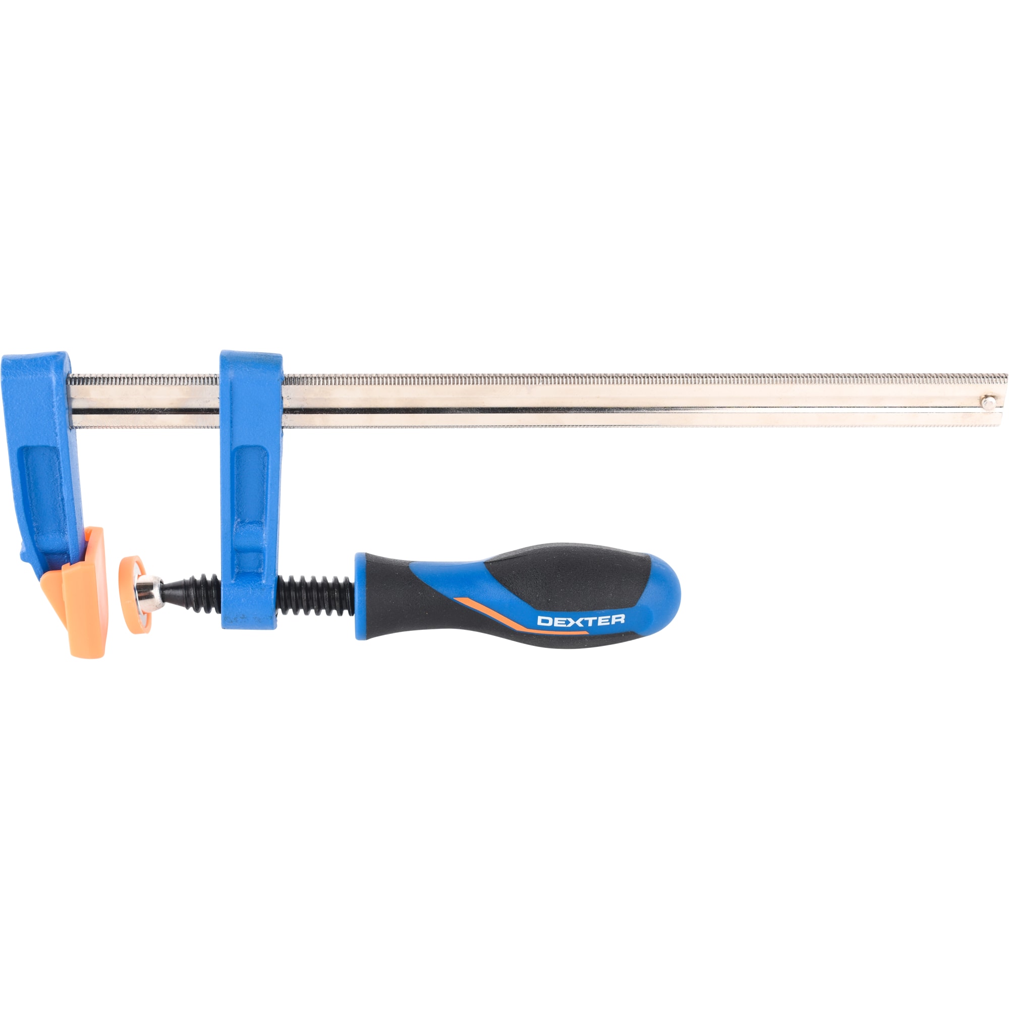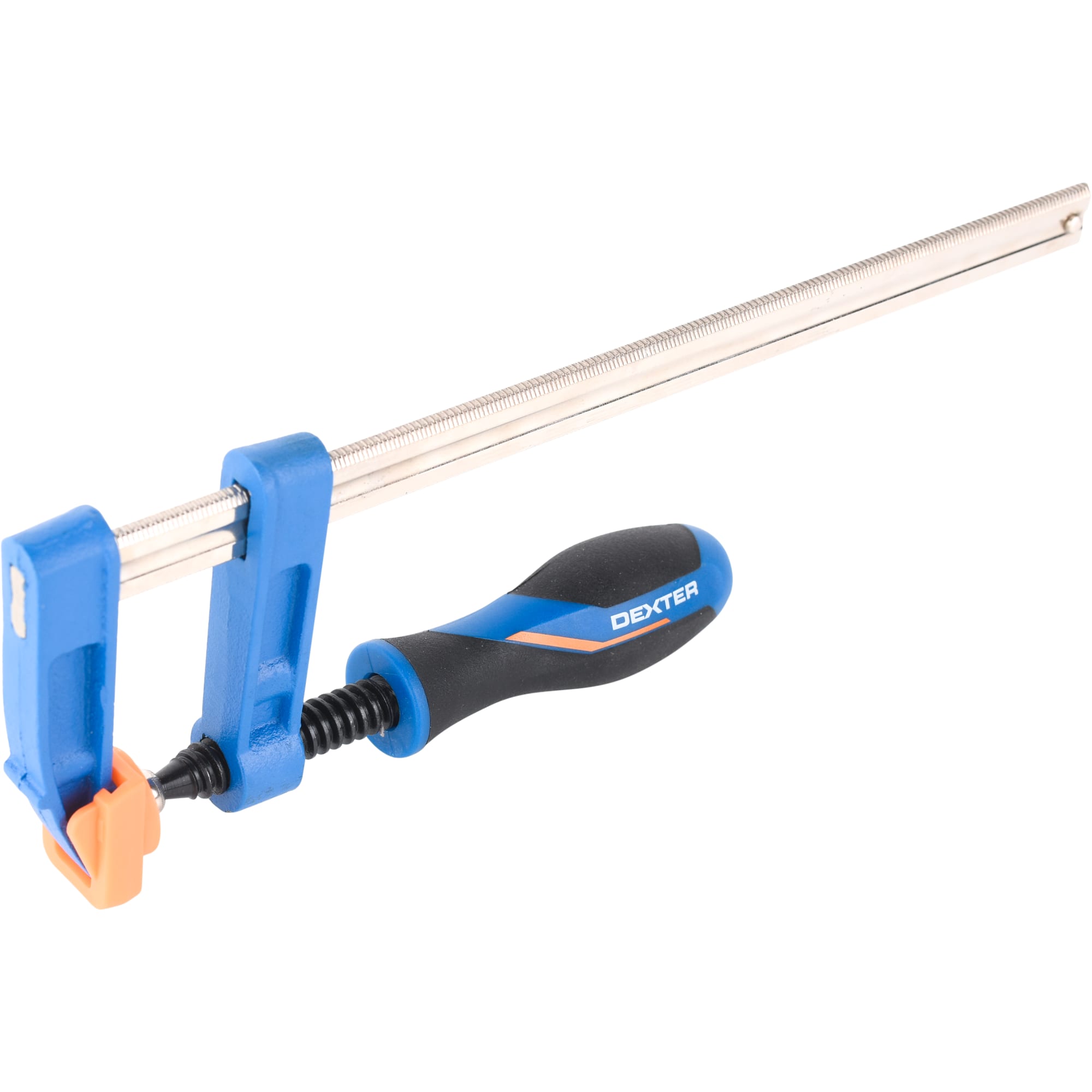 F-образная струбцина Dexter обеспечивает прочное крепление деталей при различных видах обработки и сборки. Идеальный инструмент для мастеров, требующий точности и надежности.